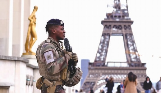 3月25日,法国士兵在巴黎特罗卡德罗广场附近巡逻警戒。法国总理阿塔尔24日晚宣布,鉴于法国面临的恐怖袭击威胁上升,法国将反恐安全警戒级别提升至最高级。法国媒体报道,离巴黎夏季奥运会开幕还有4个月时间,法国的恐袭风险不断上升。