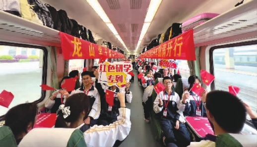 4月9日7时许,Y831次列车从龙山北站向韶山驶去。这是今年广铁集团开出的第5趟“我的韶山行”红色研学专列。