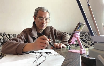 4月9日,刚值完晚班的老吴没有休息,正在家中练习国画。端坐在客厅里的四方桌前,挽好袖口,一手拿起毛笔,一手打开手机里的原图,两鬓斑白的吴世忠很快入了神。下笔沉稳,一笔一画都透着自信,不到一盏茶功夫,一棵岩缝中虬然生长的小树跃然纸上。