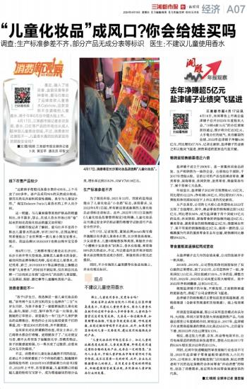 而4月17日,三湘都市报记者走访长沙IFS、长沙王府井等大型商场,却难觅儿童香水的身影。被询问的品牌导购员均称,没有卖过儿童香水。在纪梵希、娇兰、BURBERRY等品牌的线上旗舰店检索“儿童香水”,同样找不到结果。仅在屈臣氏品牌一门店找到正在做“3盒99元”活动的儿童面膜,以及唇泥、眼影、腮红棒等儿童趣味美妆产品。