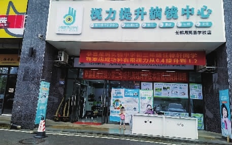 位于长沙市望城区的门店,招牌下红色横幅上写着“恭喜星城实验小学二年级×××同学在本店成功摘掉眼镜”“恭喜星城实验中学初三年级×××同学在本店成功将右眼视力从0.4提升到1.2”。
