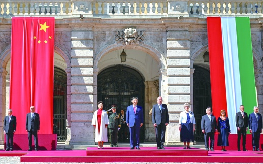 初夏时节的布达佩斯阳光明媚,古老宏伟的布达王宫庄严矗立,中匈两国国旗相映成辉。