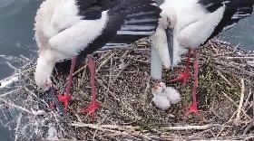 有了孩子后,这对升级为“爹妈”的亲鸟变得更为体贴。细心的白鹳妈妈不停整理鸟巢,让鸟巢更加的舒适和结实,避免突出的树枝给幼鸟带来伤害,有趣的是,摄像头还被鹳妈搞坏了;白鹳爸爸除了外出觅食,就是在一旁站岗放哨,与妻子一道守护着这个小家,不大的鸟巢俨然成了温馨的“港湾”。