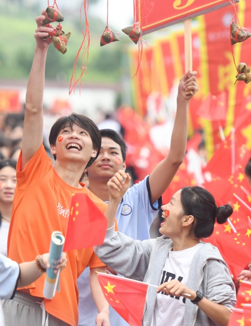 6月6日,考生触摸粽子,寓意“高中”。当天,道县道州玉潭(东阳)学校举行高考送考仪式,暖心送考。 蒋克青 摄