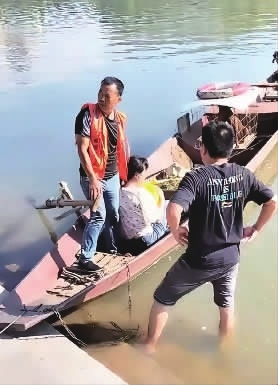 将落水女子拖上船后,丁绍银发现对方肚子撑得很大,判定她应该是呛了很多水,便给女子翻了个身,好让她把胃里的水都吐出来。