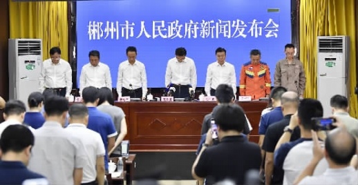 “特别是,随着道路、通信的基本抢通,初步查清,资兴市有30人遇难、35人失踪,涉及5个乡镇26个村、48个村民小组,我们深感痛心!”阚保勇提议,现场人员全体起身、低头静立,为不幸因灾遇难的同胞默哀。