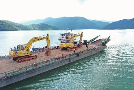 8月2日,资兴市东江湖,大型施工设备通过渡轮,运往该市陆路无法到达的东部乡镇。8月1日以来,郴州市交通水运部门积极做好应急保障,及时组织3艘汽渡船开辟水上抢险通道,竭力打通生命通道。