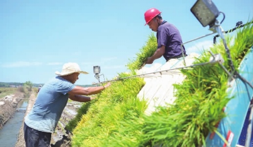 8月5日,湘潭县河口镇莲托村,村民驾驶插秧机抢插晚稻。7月底,涓水湘潭县堤段发生多处损毁,大量农田被洪水浸泡。洪水退后,受灾群众积极开展生产自救。