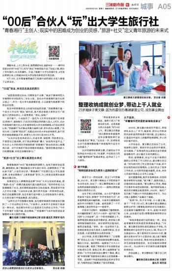 敢想敢做的“00后”既有敏锐的洞察力,也有开阔的创业思路。暑假期间,除了继续跟进大学生旅行项目,还顺势推出了“纯玩亲子团”。小吴告诉记者,“青春湘行”不仅想打造大学生旅游品牌,未来还想推出“上班族旅游”系列,为上班族实现周末旅游解决后顾之忧。