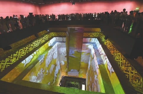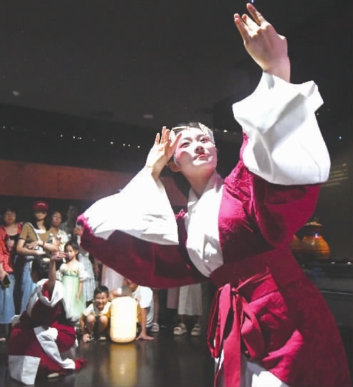今年是马王堆汉墓考古发掘50周年,湖南省博物院举办了系列活动。上图:8月18日晚,“博物馆之夜”专场,演员身穿汉服在“长沙马王堆汉墓陈列”展厅表演快闪。下图:游客在参观“长沙马王堆汉墓陈列”。