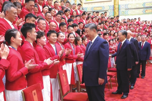 8月20日,党和国家领导人习近平、赵乐际、王沪宁、蔡奇、李希、韩正等在人民大会堂接见第33届夏季奥林匹克运动会中国体育代表团全体成员。