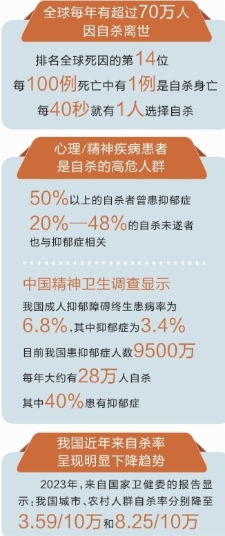 不管我们是否愿意谈及,“自杀”话题很难让人视而不见。数据显示,这已经是全球性的、巨大而复杂的公共卫生问题。我国现况如何?日常要注意什么?9月6日,记者采访了湖南省第二人民医院成人精神科(女病房)主任医师张雪花等多位专家。 ■三湘都市报全媒体记者 李琪 通讯员 孙昕