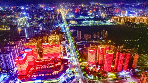9月10日晚,怀化市鹤城区各大街小巷张灯结彩,高楼大厦灯光璀璨,街头霓虹灯五彩斑斓,迎接全球湘商大会的召开。