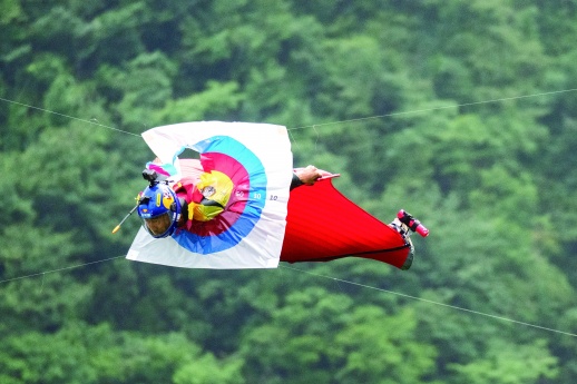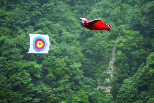9月19日,张家界天门山,第十届翼装飞行世锦赛精准穿靶赛决赛,中国选手张树鹏在全场观众的欢呼声中成功穿靶,摘得季军头衔。首次参赛的法国选手安布鲁瓦兹·塞拉诺展现出惊人实力,斩获冠军。第三次参赛的南非选手让·雅克·沃利斯荣获亚军。图为中国选手张树鹏在比赛中。