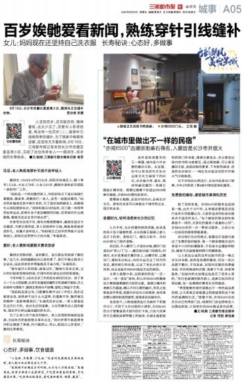 在家里完全闲不住,谁有衣物需要缝补,颜润生就会主动揽活。当着记者的面,老人现场穿针引线,熟练地将线穿进针孔,丝毫不逊年轻人。“妈妈能自己动手的事就不会依靠别人,到现在还坚持自己洗衣服。”朱福英说。