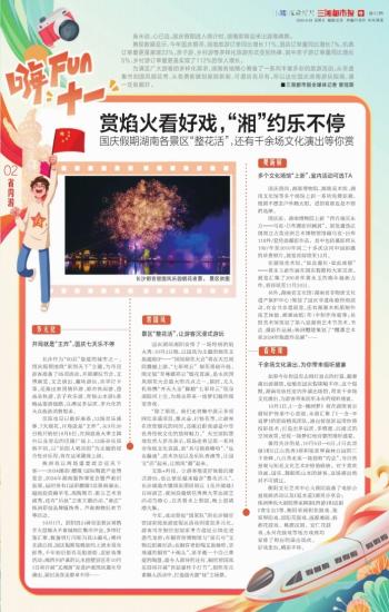 为满足广大游客的多样化需求,湖南各地精心筹备了一系列丰富多彩的旅游活动。从非遗集市到国风烟花秀,从免费新展到剧院新剧,可谓应有尽有。所以这份国庆湖南游玩指南,请一定收藏好。 ■三湘都市报全媒体记者 曾冠霖