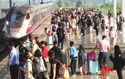 国庆黄金周最后一天迎来客流返程高峰,记者从广铁集团获悉,10月7日预计发送旅客277.2万人次,同比增加27.7万人次、增长11.1%。据介绍,短途客流主要集中在深圳至广州,衡阳、永州、邵阳至长沙,韶关、湛江、阳江、潮汕至广州等方向;而长途客流则集中在长沙至深圳、上海、北京,重庆、桂林、贵州、上海、西安至广州、深圳等方向。图为旅客在湖南省衡阳东站站台排队乘车。