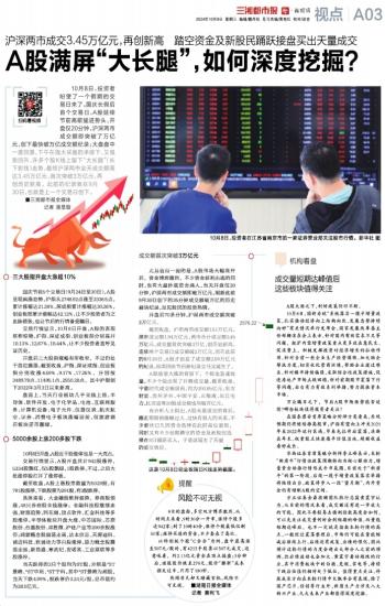 10月8日,投资者盼望了一个假期的交易日来了。国庆长假后首个交易日,A股延续节前高歌猛进势头,开盘仅20分钟,沪深两市成交额即突破了万亿元,创下最快破万亿成交额纪录;大盘盘中一度回落,下午在强大买盘的承接下,又强势回升,许多个股K线上留下“大长腿”(长下影线)走势,最终沪深两市全天成交额高达3.45万亿元,首次突破3万亿元,再创历史新高。此前的纪录就在9月30日,也就是上一个交易日创下。