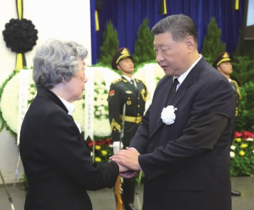 上午9时30分许,习近平、赵乐际、王沪宁、蔡奇、丁薛祥、李希、韩正等,在哀乐声中缓步来到吴邦国同志的遗体前肃立默哀,向吴邦国同志的遗体三鞠躬,并与吴邦国同志亲属一一握手,表示慰问。胡锦涛送花圈,对吴邦国同志逝世表示哀悼。