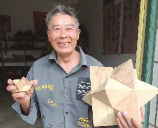 “早上去镇上赶集了,向大家展示孔明锁的神奇,来传播我们的国学文化。”10月13日,吃过中饭的谢喜良,开始捣鼓自己的木工作品,一旁的妻子充当他的“解说员”。今年80岁的谢喜良是宁乡当地的民间老手艺人,65年坚持木工手艺,把生活中的水车、风车、渔篮、孔明车等农用工具,等比例缩放成了一个个的木雕工艺品。