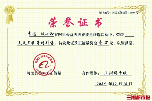10月16日,三湘都市报联合阿里公益天天正能量为李瑶夫妇颁发天天正能量特别奖,及万元正能量奖金,为夫妇俩点赞,为暖心行动助力。