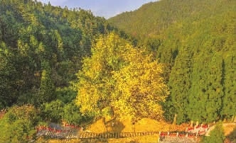 记者走进天乐堂的山谷中,首先映入眼帘的是那三棵高耸入云的银杏树,它们枝叶繁茂,树干粗壮,需三人合抱。每年的10月底至11月初,三棵银杏树便换上金色盛装。从空中俯瞰,三棵银杏树早已融为一体,将整个山谷点燃渲染得金黄耀眼,吸引了众多游客前来观看。