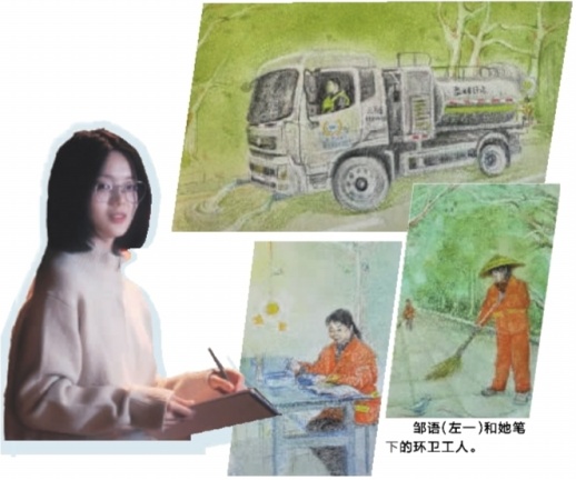 扫地的环卫阿姨、开洒水车的环卫大叔……来自湖南长沙,今年23岁的邹语用自己的方式,为“城市美容师”送上一份礼物。