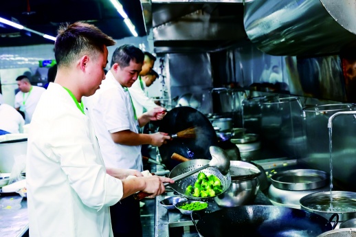 炉火明厨,热炒香炖。48名烹饪高手纷纷使出看家本领,将手中的食材变为一道道诱人的美食,扑鼻香气与腾腾热气交织在一起,弥漫在整个赛场。