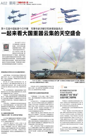 在计划于11月12日开幕的第十五届中国航展上,空军36型武器装备将集中亮相,按照“制空作战与空中打击、无人与反无人作战、战略投送与空投空降、预警探测与防空反导”4个维度,成体系展示现代化战略空军建设的阶段性成果。“即将亮相航展的空军新装备,既是体现战略空军能力的标志性装备,更是代表空天领域建设水平的前沿性装备。”军事专家王明志就空军参展装备亮点接受了记者专访。