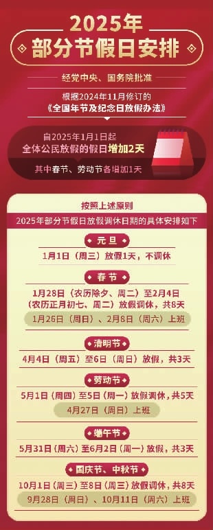 明确调休原则。除个别特殊年节外,春节自农历除夕起放假调休8天,国庆节自10月1日起放假调休7天,劳动节放假调休5天,元旦、清明节、端午节、中秋节分别放假调休或连休3天(如逢周三则只在当日放假),国庆节放假如逢中秋节则合并放假8天(2025年、2028年就是这样)。