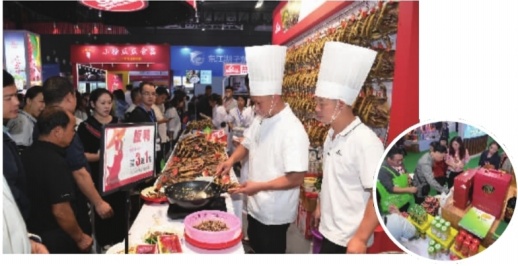 上午10时,观众们陆续进场,各展区也忙碌了起来。品牌农业馆唐人神品牌展位前挤满了试吃的观众,一道现炒腊鸭腿刚出锅就被一扫而光。现场工作人员介绍,往年展会现炒熟食一直很受欢迎,今年仍延续了这一传统。“我们还推出了酱板鸭等新品,开设了打卡免费领鸡蛋的活动,来增强与观众的互动。”