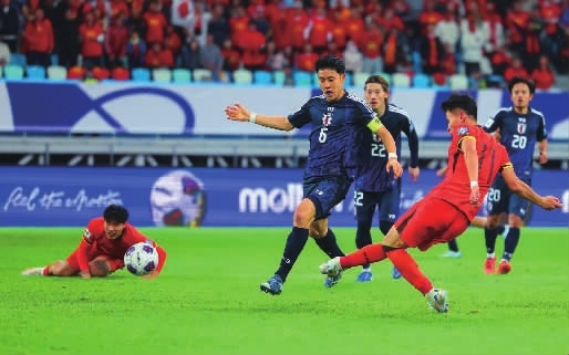 11月19日,中国队球员林良铭(前右)在比赛中射门得分。当日,在世预赛18强赛第六轮比赛中,中国队虽然1比3不敌日本队,却是5年来首次攻破日本球门。