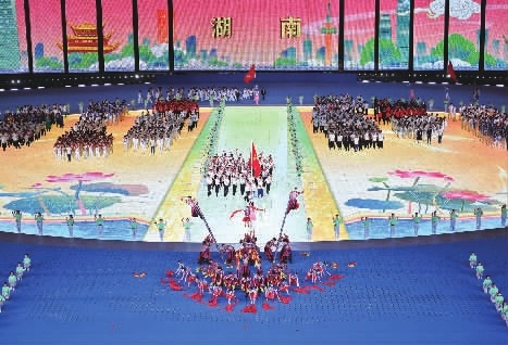 11月22日,湖南省代表团在开幕式上入场。当日,中华人民共和国第十二届少数民族传统体育运动会开幕式在海南省三亚市举行。未来八天,近万名运动员和嘉宾将齐聚南海之滨,共同谱写一曲以团结为名的民族乐章。