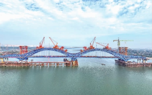 这是11月26日拍摄的长沙暮坪湘江特大桥合龙施工现场(无人机照片)。当日,随着主跨合龙段最后一段横梁安装完成,全国首座“双飞燕”四跨连续中承式钢桁拱柔性系杆拱桥——暮坪湘江特大桥全桥顺利合龙。