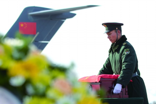 装殓仪式后,中韩双方共同将烈士遗骸棺椁运送至韩国仁川国际机场。中方在仁川国际机场停机坪举行庄严悼念仪式,奏唱中华人民共和国国歌。中国驻韩国使馆临时代办方坤为烈士遗骸棺椁一一覆盖国旗。全体人员向志愿军烈士三鞠躬。中国人民解放军仪仗司礼大队礼兵手持国旗,引领护送烈士遗骸棺椁登上空军运-20专机。