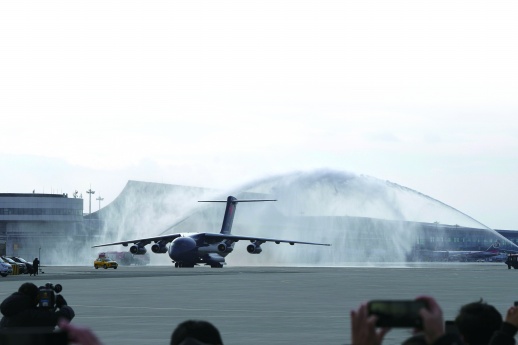12时07分,一架空军运-20专机缓缓降落在沈阳桃仙国际机场。空军两架歼-20战斗机在专机进入中国领空后为专机伴飞护航,并在沈阳桃仙国际机场上空通场飞行,向志愿军烈士致以崇高敬意。专机降落后,沈阳桃仙国际机场以“过水门”最高礼仪迎接志愿军烈士回家。