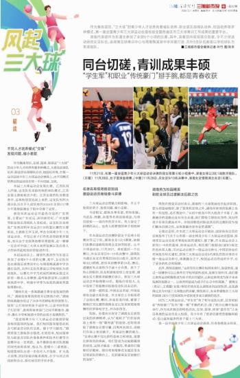 因为三大球运动会,“学生军”有了和专业队比拼,甚至和职业“传统豪门”队伍“掰一掰”手腕的机会;除了部分比赛在校园举行,作为本次赛会的特色活动,足球、篮球、排球“嘉年华”让来自各地的运动员走入校园,青少年有了更亲切紧密的接触和联动,也让越来越多的孩子爱上三大球。