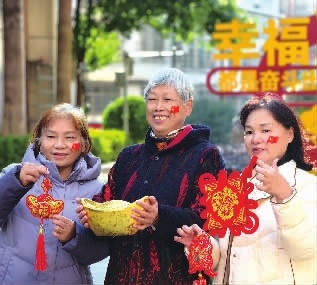 面对乌泱泱的镜头,老人们一开始有些放不开,现场的学生们挥舞起丝带,逗老人们开心,灿烂笑容在一声声快门声中被定格。拿着对联、举着糖葫芦、头戴簪花花环……明媚的阳光下,老人们的镜头感越来越好。