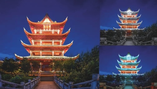 此外,滨水岸线照明也有大动作。主园路将取消原有照树灯,改为上树隐蔽安装照明,庭院灯也将升级为LED庭院灯。岸线还会新增部分染色灯与岳麓山山体灯光呼应联动,形成如诗如画的序列画轴。拱极楼节点的拱极楼、江神庙等区域建筑也将旧貌换新颜,灯光效果会大幅提升。