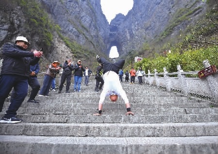 12月8日,在凛冬的寒潮中,来自山东的倒立登山者孙国山来到天门山,挑战倒立攀登999阶天梯。历经5小时,孙国山成功登顶,成为了倒立攀登天门山999阶天梯的第一人。文/视频