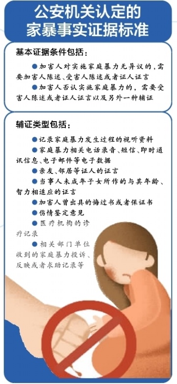 针对社会关注度较高的家庭暴力证据标准等问题,《意见》明确,公安机关认定家庭暴力事实的基本证据条件包括:加害人对实施家庭暴力无异议的,需要加害人陈述、受害人陈述或者证人证言;加害人否认实施家庭暴力的,需要受害人陈述或者证人证言以及另外一种辅证。