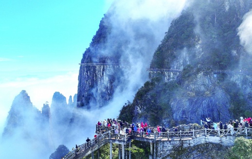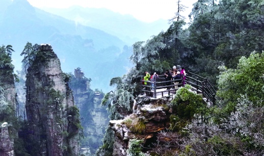 11日,雪后初晴,金色天际线与银白色雾凇交相辉映,些许云雾似衣裾翩跹环绕群峰,恍若一幅壮美画卷。漫步在天门山的游道上,仿佛置身于一个梦幻的冰雪世界,每一步都充满了惊喜。每年从11月中下旬到次年3月上旬,是天门山观赏雾凇的最佳时节。