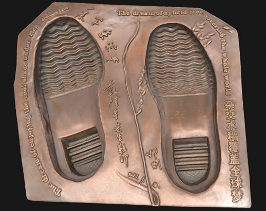 雕塑周围环绕着袁老笔迹《禾下乘凉梦》与《杂交水稻覆盖全球梦》,字字千钧,情深意长。