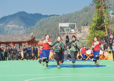 12月15日,保靖县吕洞山镇夯吉村,来自保靖夯吉队与花垣排碧队的“姑妈篮球”友谊赛在激烈对决中。“姑妈篮球”可以任意抢球、带球走或抱球不放,进球就是硬道理,旨在鼓励苗家妇女积极参与体育健身。