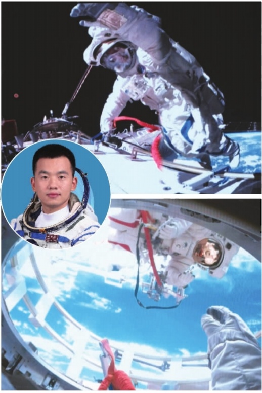 12月17日,神舟十九号航天员乘组圆满完成第一次出舱活动,完成了空间站空间碎片防护装置安装、舱外设备设施巡检及处置等任务。整个活动用时9小时,刷新了中国航天员单次出舱活动时长纪录。上图:“90后”航天员宋令东在空间站组合体舱外工作间隙挥手致意的画面。下图:航天员蔡旭哲(上)、宋令东(下)在气闸舱舱门内外工作的画面。