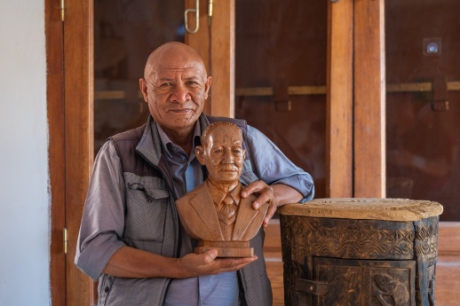 经过一个半小时的车程,我在塔那那利佛的郊区,见到了袁隆平院士头像木雕的创作者,萨洛蒙先生。他正在园区内带着徒弟雕刻木雕。