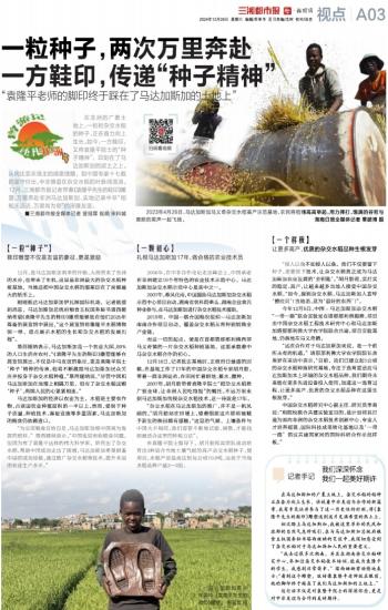 在非洲的广袤土地上,一粒粒杂交水稻的种子,正在奋力向上生长。如今,一方鞋印,又将袁隆平院士的“种子精神”,印刻在了马达加斯加的泥土之上。从冈比亚农场主的感恩馈赠,到中国专家十七载的坚守付出,中非情谊在杂交水稻的叶脉间流淌。12月,三湘都市报记者带着《袁隆平先生的鞋印》雕塑,万里奔赴非洲马达加斯加,实地记录中非“相知无远近,万里尚为邻”的深厚友谊。