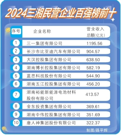 榜单显示,三一集团有限公司以1195.56亿元的营业收入位列榜首;长沙市比亚迪汽车有限公司以904.57亿元的营业收入位居第二;大汉控股集团有限公司以638.50亿元的营业收入位列第三。