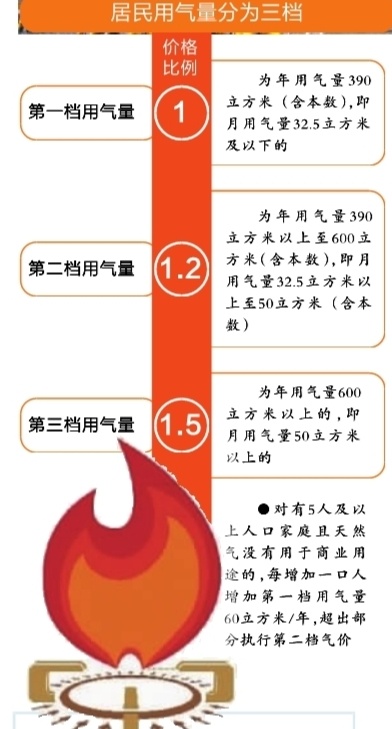 《办法》提出,按照满足不同用气需求,将居民用气量分为三档。其中,第一档气量为年用气量390立方米(含本数),即月用气量32.5立方米及以下的;第二档气量为年用气量390立方米以上至600立方米(含本数),即月用气量32.5立方米以上至50立方米(含本数)的;第三档气量为年用气量600立方米以上的,即月用气量50立方米以上的。用户用气量或购气量超过第一档气量时,燃气公司应及时告知和提醒用户。