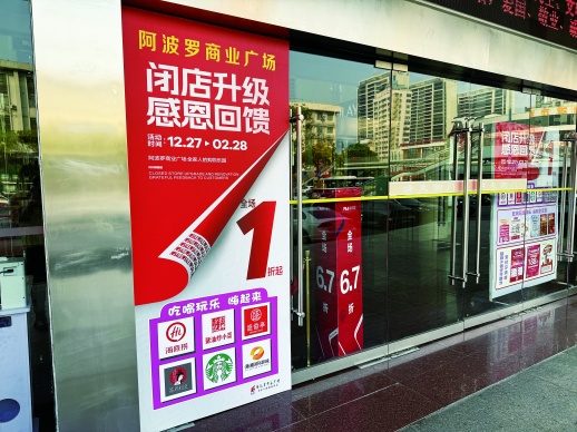 1月2日,阿波罗商业广场东门位置,巨大的红色广告幕布已挂出,“闭店升级,感恩回馈”几个大字显得格外醒目,仿佛一种无声的告别。商场内仍在正常经营,并没有出现大量品牌撤店或清仓。